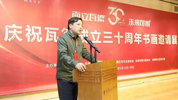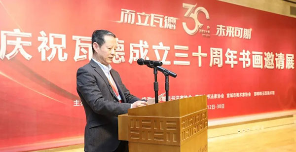 瓦德集團(tuán)董事長(zhǎng)謝富強(qiáng)向與會(huì)的各路藝術(shù)家及賓朋表達(dá)了熱情歡迎。向河北邯鄲、湖北黃石、安徽宣城三地文聯(lián)、書(shū)協(xié)、美協(xié)和書(shū)畫(huà)家們的大力支持表達(dá)了衷心感謝。尤其對(duì)中國(guó)知名書(shū)畫(huà)家,邯鄲市書(shū)協(xié)主席,文化名人,著名企業(yè)家韓玉臣先生對(duì)瓦德集團(tuán)慶典活動(dòng)的鼎力支持表達(dá)了深深的敬意和由衷地感謝。在三千年歷史的趙國(guó)都城邯鄲,能有瓦德集團(tuán)如此注重文化藝術(shù)的實(shí)屬難得,能將深厚的中國(guó)文化的脈絡(luò)注入到自己的企業(yè)產(chǎn)品中非常難得。